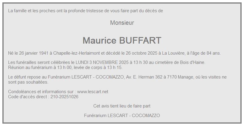 Avis de décès de Monsieur Maurice BUFFART